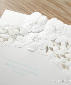 Thiệp cưới gập ba đơn giản nhưng được thiết kế sáng tạo với dải lá được cắt laser bằng kĩ thuật hiện đại, điểm xuyến ở trung tâm là một bông hoa, kết hợp với hai bông hoa nữa được dập nổi ở mặt thiệp còn lại tạo nên sự kết hợp đầy thu hút và mới lạ.