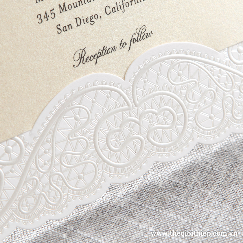 Phần trung tâm được kẹp thiệp thông tin màu kem bởi nét cắt của rãnh trên và rãnh dưới được cắt giúp chúng chắc chắn hơn mà vẫn không kém phần tinh tế. Chất lượng giấy cao cấp, có ánh nhũ nhẹ giúp tôn lên sự đẳng cấp vốn có của thiệp cưới.